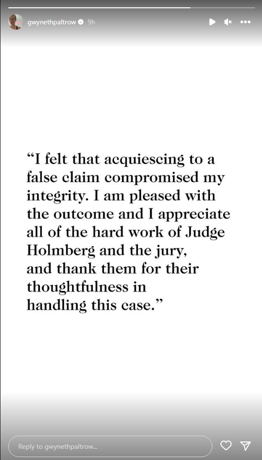 Η Πάλτροου, ηθοποιός πάντα, εμφανίστηκε εντελώς ανέκφραστη την ώρα που ανακοινώθηκε η ετυμηγορία. Στη συνέχεια, αποχώρησε από τη δικαστική αίθουσα, αν και πρώτα έκανε μια στάση από την πλευρά που καθόταν ο Σάντερσον. Του ευχήθηκε «να είναι καλά», με εκείνον να της απαντάει «σε ευχαριστώ αγαπητή μου», όπως μετέδωσαν τα μέσα ενημέρωσης που κάλυπταν τη δίκη.