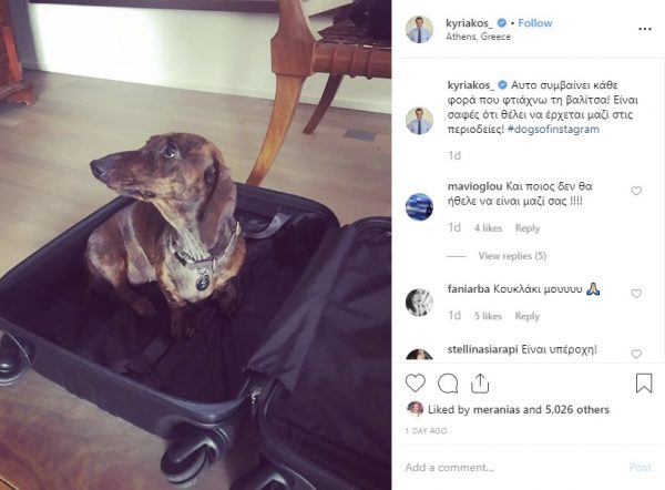 «Αυτό συμβαίνει κάθε φορά που φτιάχνω τη βαλίτσα! Είναι σαφές ότι θέλει να έρχεται μαζί στις περιοδείες!» ανέφερε στην ανάρτηση του ο πρόεδρος της ΝΔ, η οποία έτυχε θερμής ανταπόκρισης από τον κόσμο στα σχόλια –μεταξύ αυτών ο σεφ Βαγγέλης Δρίσκας που του απευθύνθηκε με ένα «κύριε Κυριάκο»