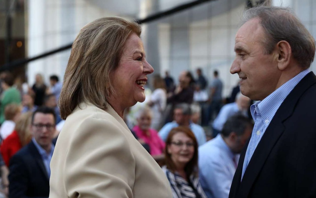 Ο φωτογραφικός φακός τη συνέλαβε να έχει και μια θερμή χειραψία με τον κ. Μικρούτσικο υπό το βλέμμα του Νίκου Σοφιανού, υποψήφιου του ΚΚΕ για τη δημαρχία της Αθήνας.