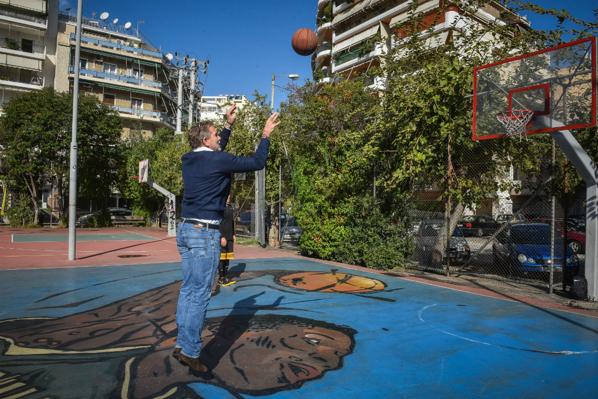Εκεί, πέραν των άλλων συναντήσεών του, ο πρώην υπουργός δοκίμασε και το ταλέντο του στο μπάσκετ, ρίχνοντας μερικά σουτ στο γήπεδο όπου υπάρχει το περίφημο γκράφιτι των Αντετοκούνμπο.