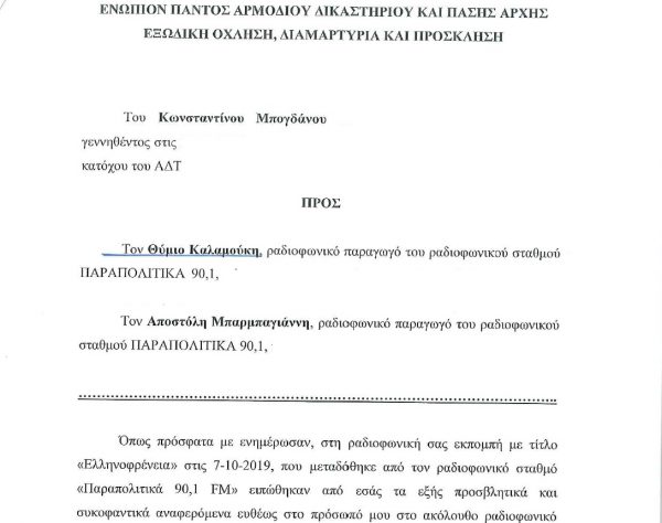O Μπογδάνος έστειλε εξώδικο στην «Ελληνοφρένεια» για τον χαρακτηρισμό «ρουφιάνος»