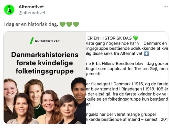 Η 100% θηλυκή κοινοβουλευτική ομάδα πανηγύρισε το γεγονός στα σόσιαλ μίντια: «Σήμερα είναι ιστορική ημέρα! Η Δανία, πρώτη φορά στην Ιστορία, έχει αποκλειστικά γυναικεία κοινοβουλευτική ομάδα. Οι Δανέζες απέκτησαν δικαίωμα ψήφου το 1915 και εξελέγησαν πρώτη φορά βουλευτίνες το 1918. Από τότε έχουν περάσει 105 χρόνια». Ωστόσο, η κριτική για τα πανηγύρια προήλθε από άτομο υπεράνω πάσης υποψίας. Αντέδρασε η υπουργός Ισότητας Marie Bjerre, θυμίζοντας, όπως έγραψε η Repubblica, την ταινία «Barbie», στην οποία οι γυναίκες ζουν ευτυχισμένες στην Barbieland χωρίς του ιππότες τους.