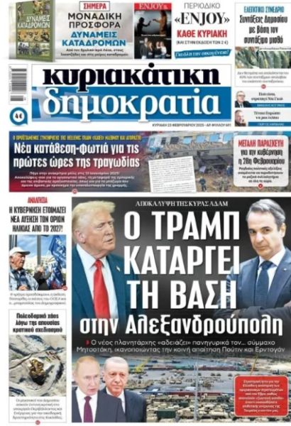 Ο τίτλος του δημοσιεύματος της «δημοκρατίας» που κυκλοφόρησε την Κυριακή, ανέφερε πως «Ο Τρμαπ καταργεί τη βάση στην Αλεξανδρούπολη». «Ο νέος πλανητάρχης “αδειάζει” πανηγυρικά τον… σύμμαχο Μητσοτάκη, ικανοποιώντας την κοινή απαίτηση Πούτιν και Ερντογάν» συμπλήρωνε ο υπότιτλος στο επίμαχο πρωτοσέλιδο (βλ. παρακάτω).