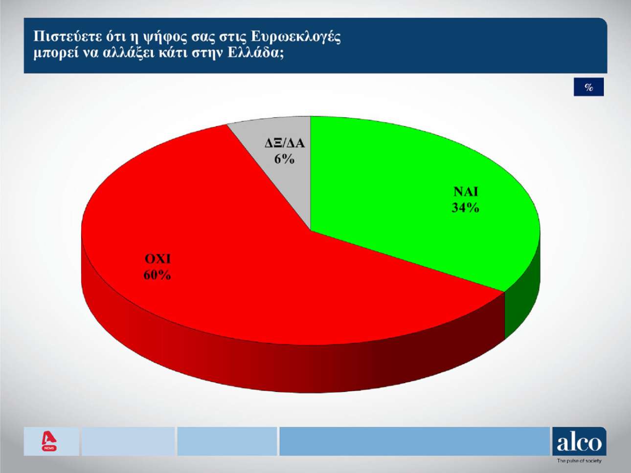 Αξίζει να αναφερθεί πως το 46% των ερωτηθέντων απάντησε θετικά στην ερώτηση της Alco αν η ψήφος στις ευρωεκλογές θα είναι ψήφος διαμαρτυρίας. Ιδιο ποσοστό κατέγραψε και η αρνητική απάντηση.