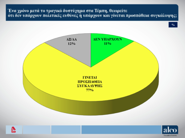 Σε ένα άλλο σημαντικό εύρημα της δημοσκόπησης της Alco, η πλειοψηφία των ερωτηθέντων, σε ποσοστό 77%, πιστεύει πως «δεν έχουν γίνει όσα πρέπει για να μην επαναληφθεί» η τραγωδία των Τεμπών.