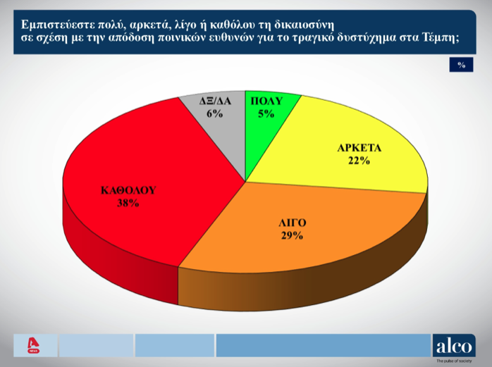 Σε ό,τι αφορά την απόδοση των ποινικών ευθυνών για τα Τέμπη, έναν χρόνο μετά το πολύνεκρο σιδηροδρομικό δυστύχημα, οι πολίτες ανέφεραν, επίσης σε μεγάλα ποσοστά, ότι δεν έχουν εμπιστοσύνη στο έργο της Δικαιοσύνης.