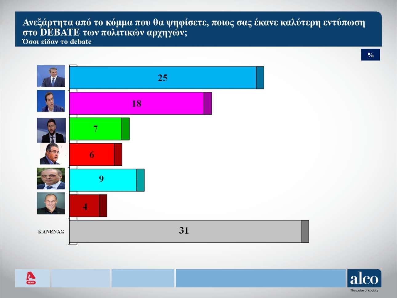 Αξίζει να αναφερθεί ότι από το ντιμπέιτ των πολιτικών αρχηγών ο Κυριάκος Μητσοτάκης συγκέντρωσε το μεγαλύτερο ποσοστό θετικών εντυπώσεων (25%). Ακολουθούν ο Αλέξης Τσίπρας με 18%, ο Κυριάκος Βελόπουλος με 9% και Νίκος Ανδρουλάκης με 7%.