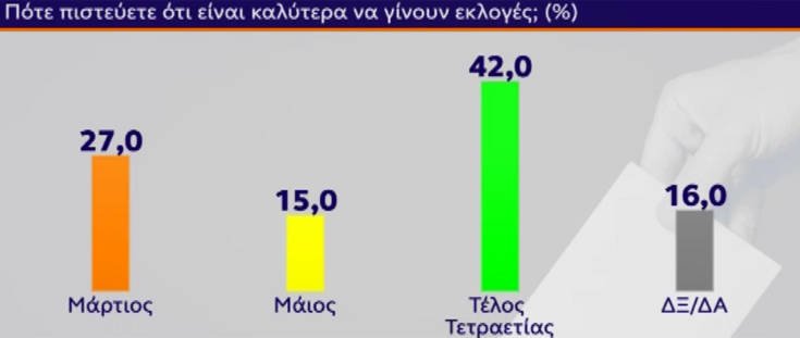 Στην ερώτηση «Πότε πιστεύεται ότι είναι καλύτερα να γίνουν εκλογές;», οι πολίτες απαντούν: «Μάρτιος» το 27%, «Μάιος» το 15% και «Στο τέλος της τετραετίας» το 42%.