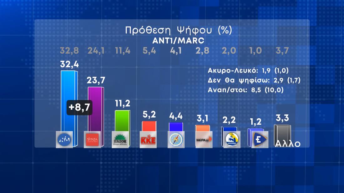 Στις 8,7 μονάδες βρίσκεται η διαφορά μεταξύ Νέας Δημοκρατίας και ΣΥΡΙΖΑ στην πρόθεση ψήφου, μερικούς μήνες –το πολύ οκτώ– από τις εκλογές: αυτό κατέδειξε δημοσκόπηση της Marc για τον ΑΝΤ1 που παρουσιάστηκε το βράδυ της Τρίτης, καθώς το κυβερνών κόμμα προτιμάται από το 32,4% των ερωτηθέντων ενώ ο ΣΥΡΙΖΑ από το 23,7%.