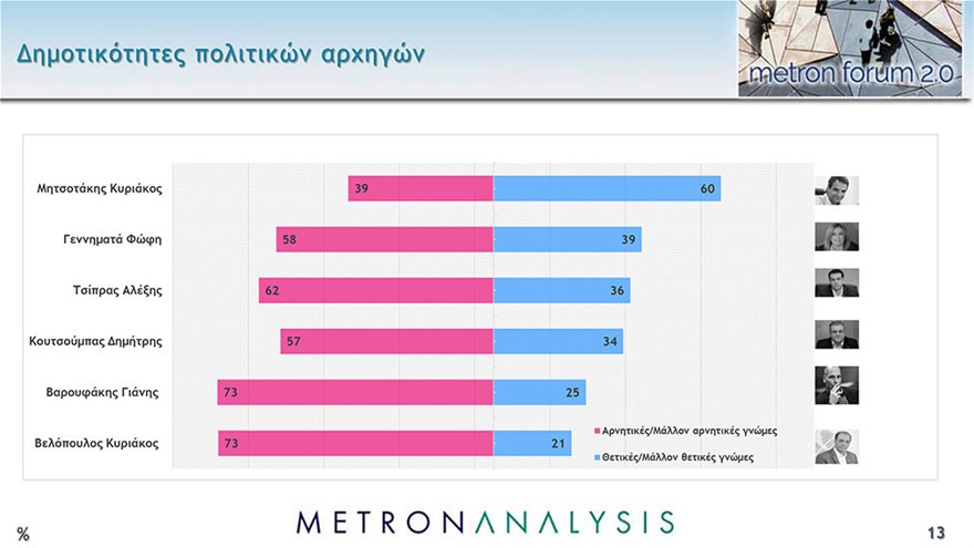 Στη δημοτικότητα των πολιτικών αρχηγών ο Κυριάκος Μητσοτάκης προηγείται με μεγάλη διαφορά, συγκεντρώνοντας το 60% των θετικών γνωμών. Ενδιαφέρον στοιχείο είναι ότι στη δεύτερη θέση βρίσκεται όχι ο πρόεδρος του ΣΥΡΙΖΑ αλλά η Φώφη Γεννηματά με 39% θετικές γνώμες και τρίτος ακολουθεί ο Αλέξης Τσίπρας με 36% θετικές γνώμες και 62% αρνητικές.