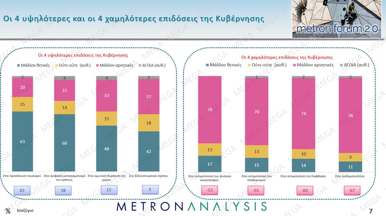 Οι χαμηλότερες επιδόσεις εντοπίζονται στην εγκληματικότητα, την αντιμετώπιση της διαφθοράς, την αντιμετώπιση του πληθωρισμού και την αντιμετώπιση των φυσικών καταστροφών, σύμφωνα με τη δημοσκόπηση της Metron Analysis.