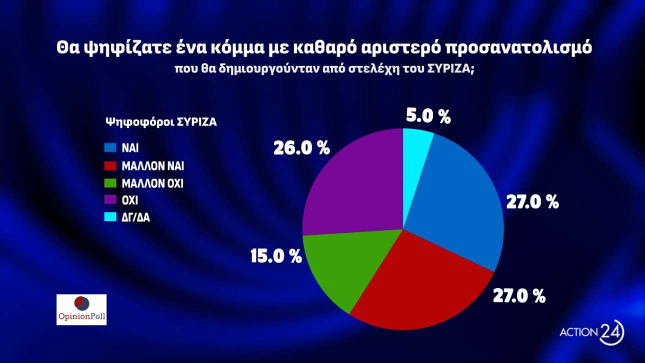 Σε ερώτηση που αφορά το ενδεχόμενο δημιουργίας νέου κόμματος «με καθαρό αριστερό προσανατολισμό που θα δημιουργούνταν από στελέχη του ΣΥΡΙΖΑ» και απευθύνεται, εξίσου, σε ψηφοφόρους του ΣΥΡΙΖΑ, το 54% απάντησε πως θα το στήριζε («Ναι» και «Μάλλον Ναι»). «Μάλλον όχι» δήλωσε το 15% και «Οχι» το 26%. Δεν γνωρίζω/δεν απαντώ δήλωσε το 5%.