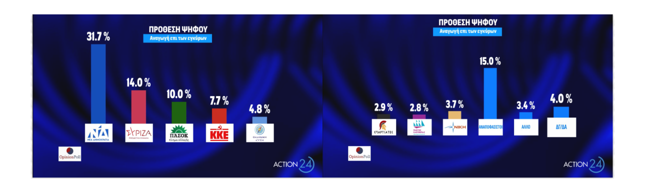 Σε ό,τι αφορά την πρόθεση ψήφου (με αναγωγή επί των έγκυρων), η Νέα Δημοκρατία συγκεντρώνει ποσοστό 31,7%, ο ΣΥΡΙΖΑ 14%, το ΠΑΣΟΚ-ΚΙΝΑΛ 10%, το ΚΚΕ 7,7%, η Ελληνική Λύση 4,8%, οι Σπαρτιάτες 2,9%, η Πλεύση Ελευθερίας 2,8% και η Νίκη 3,7%. Στο 15% οι αναποφάσιστοι.