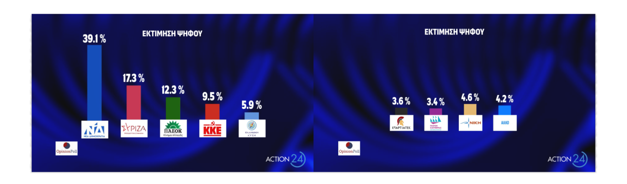 Οσον αφορά στην εκτίμηση ψήφου, η Νέα Δημοκρατία συγκεντρώνει ποσοστό 39,1%, ο ΣΥΡΙΖΑ 17,3%, το ΠΑΣΟΚ-ΚΙΝΑΛ 12,3%, το ΚΚΕ 9,5%, η Ελληνική Λύση 5,9%, οι Σπαρτιάτες 3,6%, η Πλεύση Ελευθερίας 3,4% και η Νίκη 4,6%.