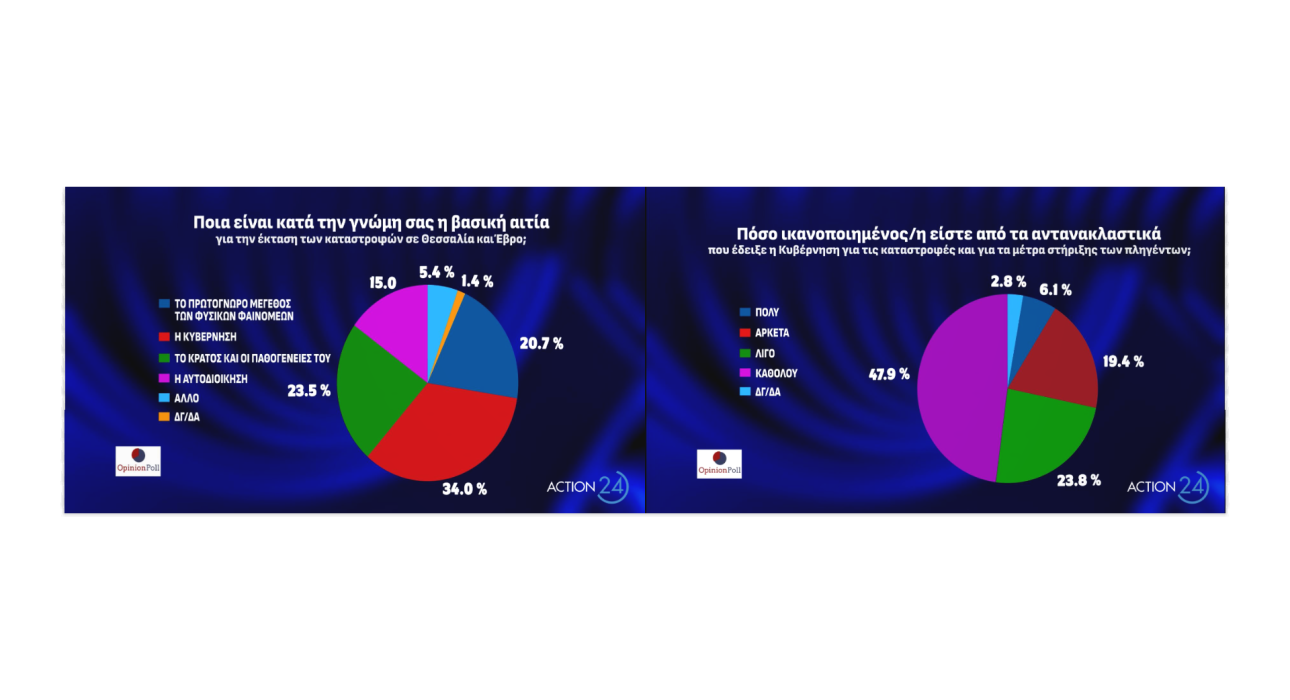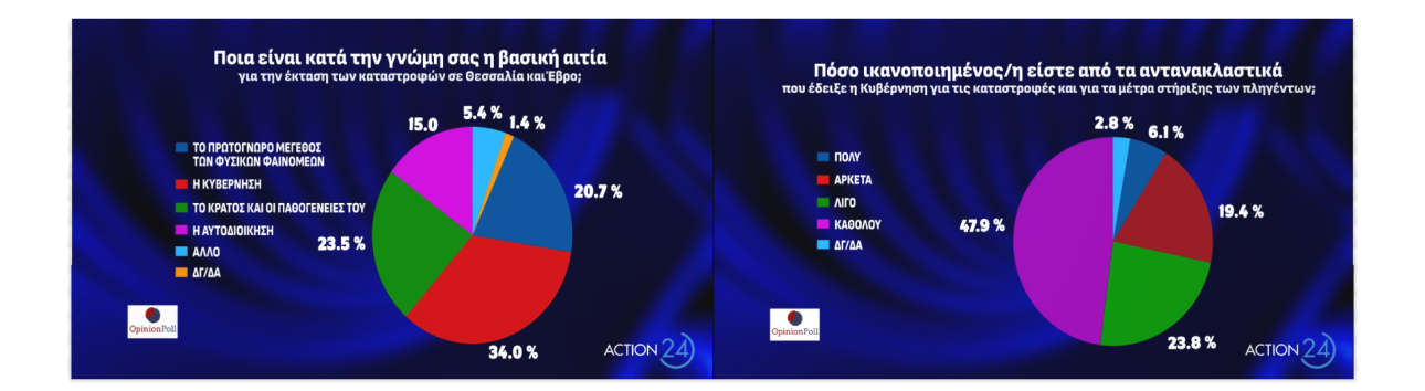 Στο ερώτημα «ποια είναι η βασική αιτία για την έκταση των καταστροφών σε Θεσσαλία και Εβρο», το 34% απάντησε η «κυβέρνηση» ενώ το 20,7% το «πρωτόγνωρο μέγεθος των φυσικών φαινομένων».