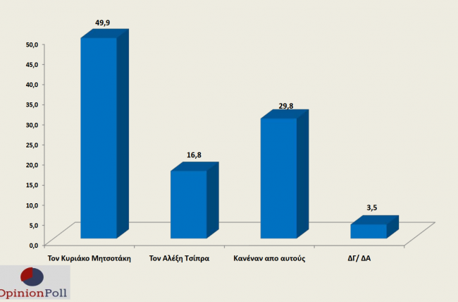 Ισχυρή είναι η υπεροχή του Κυριάκου Μητσοτάκη στην καταλληλότητα για Πρωθυπουργός. Ενας στους δύο πολίτες (49,9%) τον θεωρεί καταλληλότερο έναντι μόλις 16,8% για τον Αλέξη Τσίπρα που υπολείπεται του «κανένα» (29,8%).