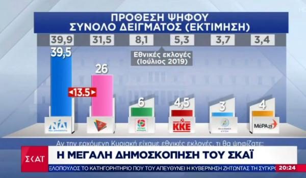 Στην πρώτη μέτρηση της εταιρείας μετά τις εκλογές της 7ης Ιουλίου και την εμφάνιση των πολιτικών αρχηγών στη ΔΕΘ, η Νέα Δημοκρατία συγκεντρώνει ποσοστό 39,5% στην πρόθεση ψήφου με τον ΣΥΡΙΖΑ να βρίσκεται στο 26%. Ακολουθεί το ΚΙΝΑΛ με 6%, το ΚΚΕ με 4,5%, το ΜεΡΑ25 με 4% και η Ελληνική Λύση είναι στο 3%.