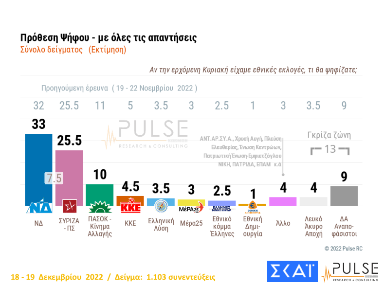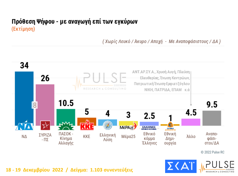 Ειδικότερα, η δύναμη των κομμάτων στην πρόθεση ψήφου με αναγωγή επί των εγκύρων αποτυπώθηκε από την έρευνα, η οποία διενεργήθηκε το διάστημα 18 – 19 Δεκεμβρίου σε δείγμα 1.103 πολιτών με δικαίωμα ψήφου, ως ακολούθως: ΝΔ 34%, ΣΥΡΙΖΑ 26%, ΠΑΣΟΚ 10,5%, ΚΚΕ 5%, Ελληνική Λύση 4%, ΜέΡΑ 25 3%.