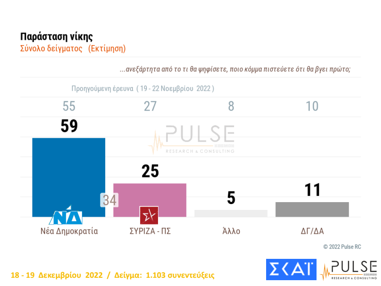 Ακόμη πιο εντυπωσιακή είναι η άνοδος της ΝΔ στην παράσταση νίκης. Το ποσοστό της τον Δεκέμβριο ανέβηκε κατά τέσσερις μονάδες (59%) από τον Νοέμβριο (55%).
