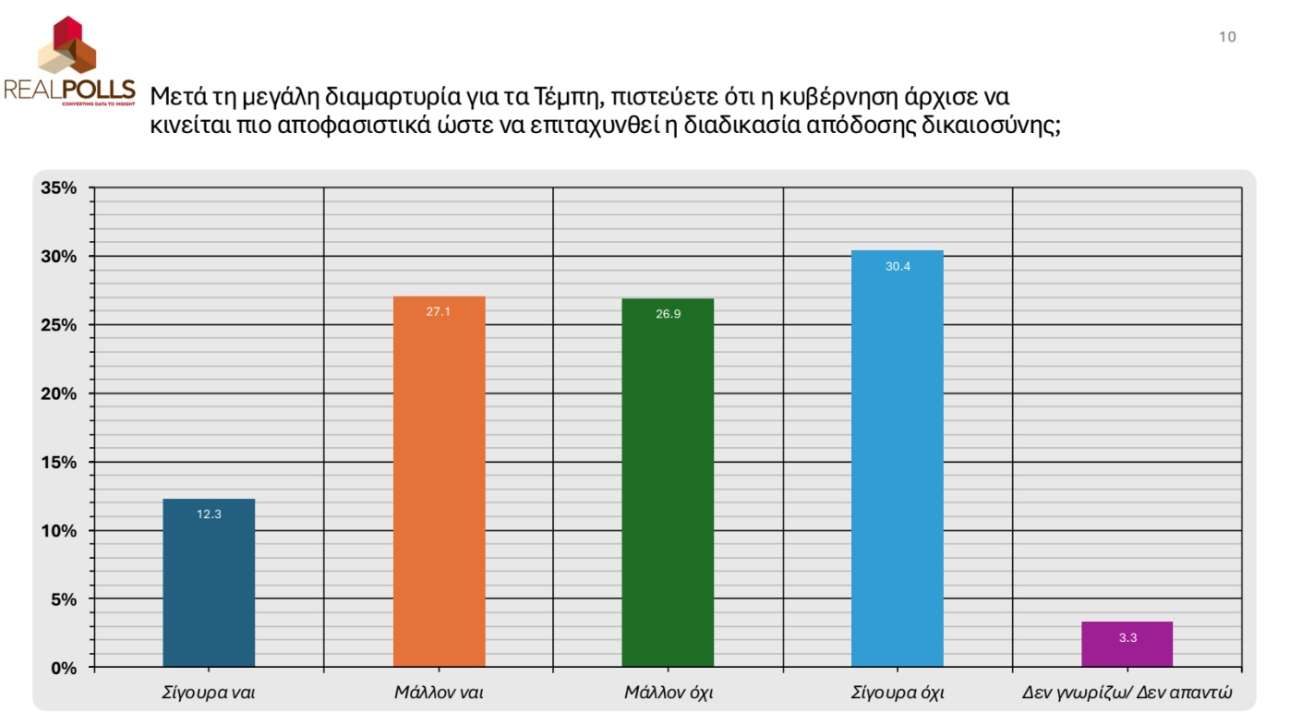 Σε άλλο σχετικό ερώτημα, αν η κυβέρνηση κινείται πιο αποφασιστικά για τα Τέμπη μετά τα μεγάλα συλλαλητήρια της 26ης Ιανουαρίου και πάλι η μεγάλη πλειοψηφία (57,3%) απαντά αρνητικά, εκφράζοντας τη δυσπιστία της. Ενα 39,4% των ερωτηθέντων πάντως, εκτιμά πως, λίγο ή πολύ, η κυβέρνηση δείχνει μεγαλύτερη αποφασιστικότητα το τελευταίο διάστημα (Πίνακας V).