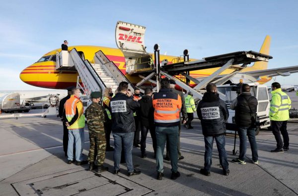 Τα εμβόλια έφθασαν με ειδική πτήση της εταιρείας μεταφορών DHL που προσγειώθηκε στον αεροδρόμιο «Ελευθέριος Βενιζέλος» το πρωί της Τρίτης.