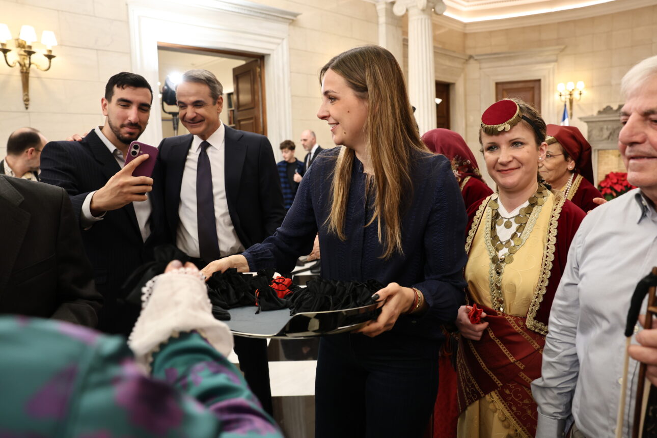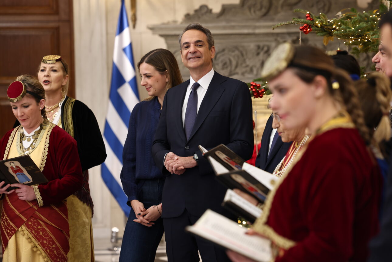 Κάλαντα της Πρωτοχρονιάς άκουσε στο Μέγαρο Μαξίμου ο Πρωθυπουργός Κυριάκος Μητσοτάκης και η κόρη του Σοφία, από μέλη της Ένωσης Λιοσιωτών Ιλίου και της Ένωσης Ποντίων Γλυφάδας.