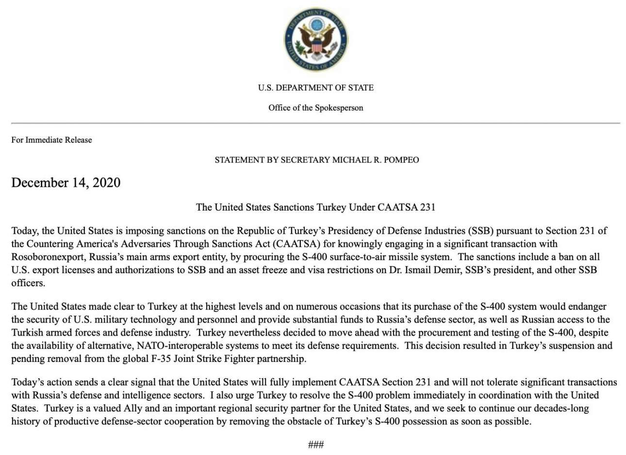 «Τα μέτρα που ελήφθησαν σήμερα είναι ένα ξεκάθαρο μήνυμα ότι οι ΗΠΑ δεν θα ανεχθούν σημαντικές συναλλαγές με τους τομείς άμυνας και πληροφοριών της Ρωσίας», υπογράμμισε ο Μάικ Πομπέο. «Η αγορά από την Τουρκία των ρωσικών S-400 θέτει σε κίνδυνο την ασφάλεια της στρατιωτικής τεχνολογίας των ΗΠΑ και του αμερικανικού προσωπικού», πρόσθεσε.