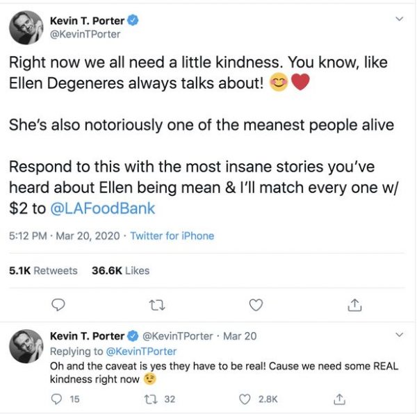 Τότε λοιπόν, ο Πόρτερ είπε για την Έλεν Ντε Τζένερις ότι είναι «ένας από τους πιο κακούς ανθρώπους εν ζωή» και κάπως έτσι ξεκίνησε μία συζήτηση στο Twitter, ζητώντας από οποιονδήποτε που αντιμετώπισε παρόμοιες καταστάσεις με την Έλεν να βγει μπροστά και να μιλήσει.
