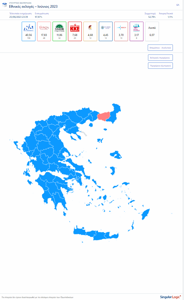 Εκλογές 2023: Θρίαμβος ΝΔ με διαφορά 22 μονάδων από τον ΣΥΡΙΖΑ στο 97% της ενσωμάτωσης