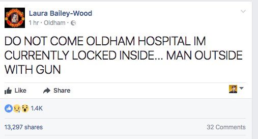 Λίγο μετά την επίθεση κυκλοφόρησε η πληροφορία, όπως σε αυτό το tweet παρακάτω, ότι ένας ένοπλος είχε εντοπιστεί κοντά σε νοσοκομείο έξω από το Μάντσεστερ. Γράφτηκε μάλιστα και από δύο βρετανικές εφημερίδες, την Daily Express και την Daily Star.