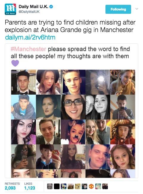 Ομως και η ίδια η Αριάνα Γκράντε έπεσε θύμα αυτών των ψευδών αναφορών. Κυκλοφόρησε μια φωτογραφία με την ίδια ταλαιπωρημένη που δήθεν ήταν λίγη ώρα μετά την επίθεση. Αποδείχτηκε –και αυτή αρκετά γρήγορα- ότι ήταν φωτογραφία της από το 2015 από γυρίσματα κινηματογραφικής ταινίας.