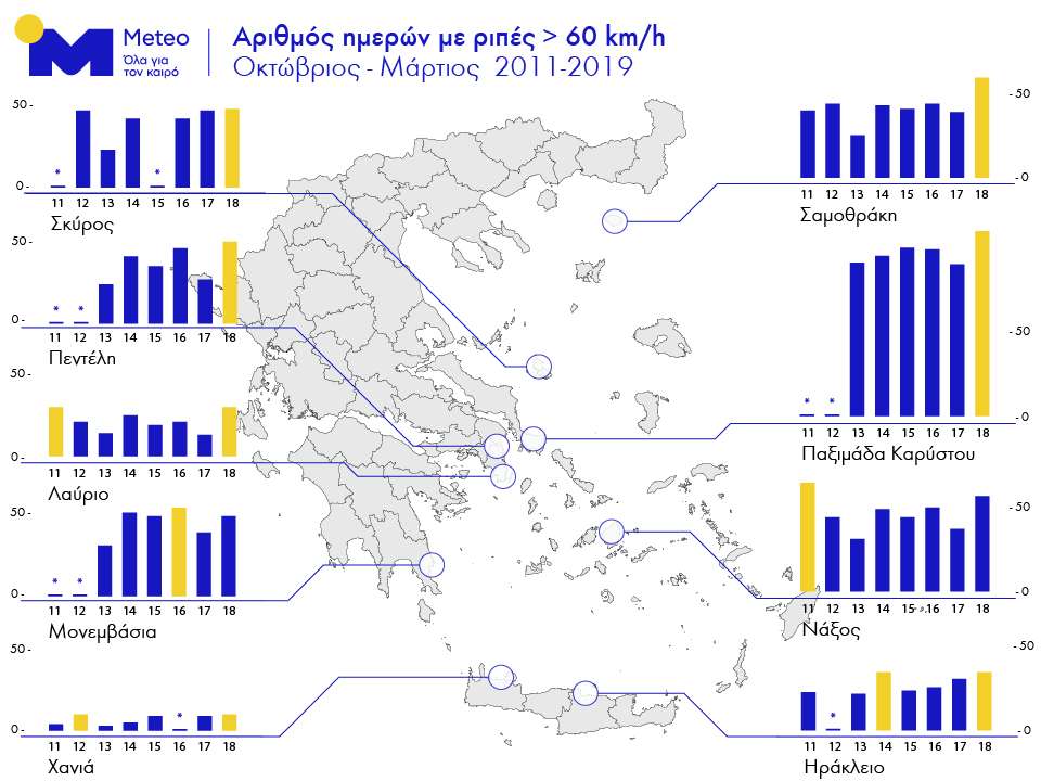 Στο διάγραμμα που ακολουθεί (πηγή meteo.gr) παρουσιάζεται ο αριθμός των ημερών με ριπές ανέμου μεγαλύτερες των 60 km/h σε επιλεγμένους σταθμούς του Εθνικού Αστεροσκοπείου/meteo.gr (σε κάθε διάγραμμα χρωματίζεται με κίτρινο ο μεγαλύτερος αριθμός ημερών στο διάστημα 2011-2018) .