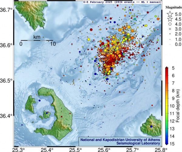 Το Εργαστήριο Σεισμολογίας (ΕΣ) του ΕΚΠΑ (dggsl.geol.uoa.gr), από την έναρξη του σεισμικού σμήνους στη ζώνη Σαντορίνης-Αμοργού στις 26 Ιανουαρίου έως και τις 7 Φεβρουαρίου 2025, έχει ανιχνεύσει και εντοπίσει συνολικά πάνω από 11,700 επιλεγμένους σεισμούς με μεθόδους μηχανικής μάθησης (τεχνητής νοημοσύνης), εκ των οποίων άνω των 9,600 με μεγέθη Μ≥1.0.