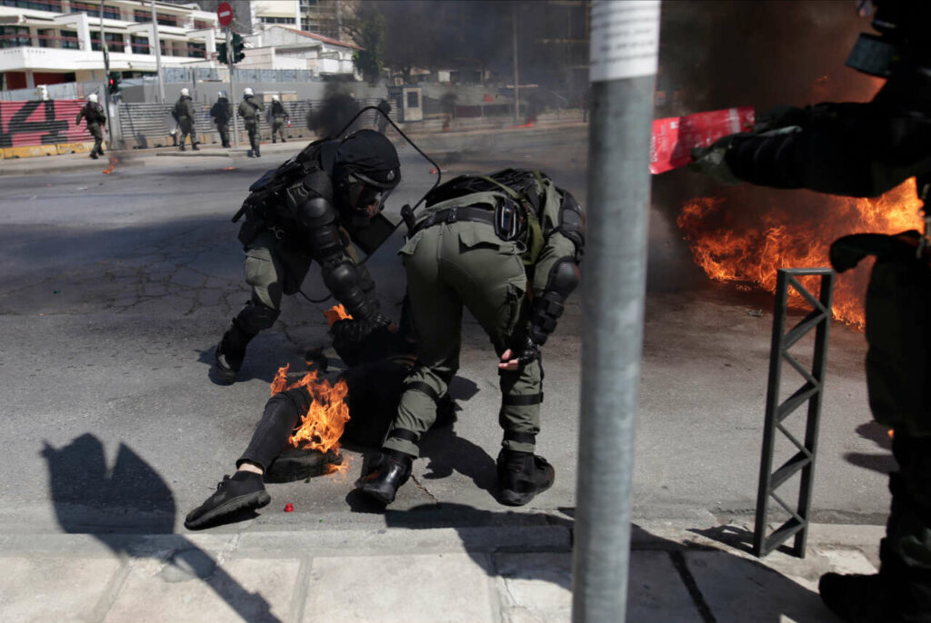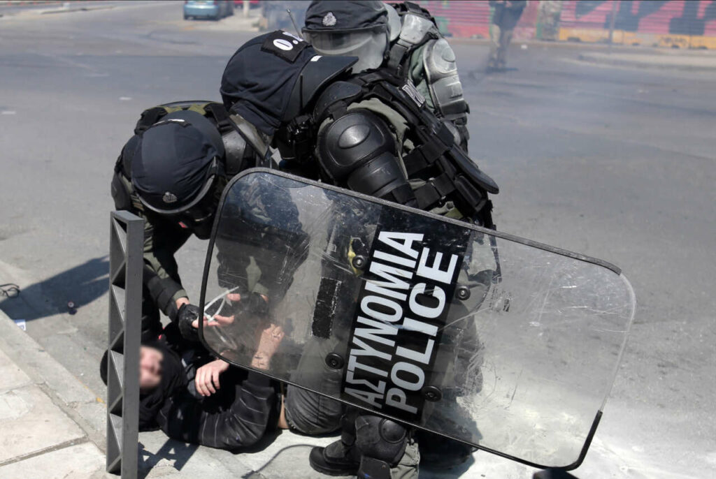 Ομάδα διαδηλωτών πέταξε πέτρες, μπουκάλια και βόμβες μολότοφ σε αστυνομικούς και εκείνοι τους απώθησαν με οβίδες κρότου – λάμψης και καπνογόνα.