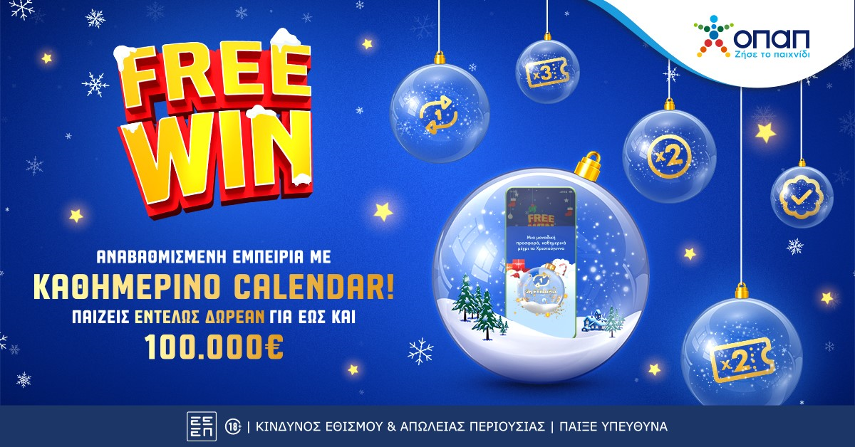 Το FREEWIN στα καταστήματα ΟΠΑΠ μπαίνει σε εορταστικό κλίμα, επιφυλάσσοντας καθημερινά εκπλήξεις για τους παίκτες.