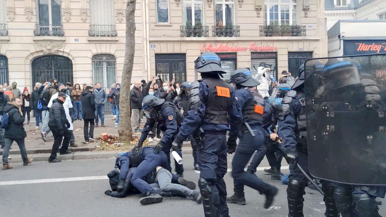 Στο Παρίσι, αστυνομικοί έκαναν χρήση δακρυγόνων όταν δέχθηκαν επίθεση από κουκουλοφόρους, στο περιθώριο της πορείας διαμαρτυρίας, ενώ περίπου 30 άνθρωποι συνελήφθησαν.