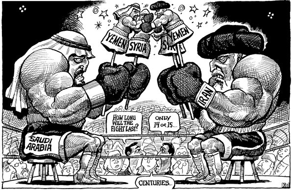 Σαουδική Αραβία εναντίον Ιράν. Ενας αγώνας μποξ βαρέων βαρών. Αμφότεροι χρησιμοποιούν τη Συρία και την Υεμένη ως άμυνα. «Πόσο θα κρατήσει ο αγώνας;» διερωτάται ένας θεατής, για να πάρει πληρωμένη απάντηση από τον διπλανό του: «Μόνο… 14 με 15 αιώνες».