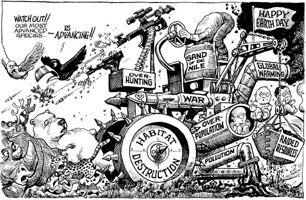 Οι άνθρωποι επεκτείνονται. Δεν έχουν έλεος, ούτε φρόνηση. Οπλα, μόλυνση του περιβάλλοντος, μαζικές καταστροφές και κάμποσα άλλα πλήγματα που καταφέρνουν στον πλανήτη, «την ημέρα της Γης» (οποία παραδοξότητα). Τα ζώα αποχωρούν τρομαγμένα. Δύο πουλιά λένε: «Προσοχή, το πιο εξελιγμένο είδος προοδεύει».