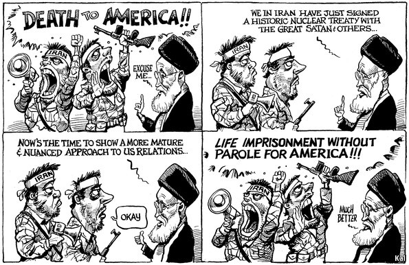 Ο ανώτατος πνευματικός ηγέτης του Ιράν, Αλί Χαμενεΐ λέει σε δύο φανατικούς που κραυγάζουν υπέρ του θανάτου των ΗΠΑ «Ξέρετε, εμείς στο Ιράν υπογράψαμε μια ιστορική συμφωνία για τα πυρηνικά με τον μεγάλο Σατανά και άλλους. Τώρα είναι καιρός να δείξουμε μια πιο ώριμη προσέγγιση στις σχέσεις μας με τις ΗΠΑ.