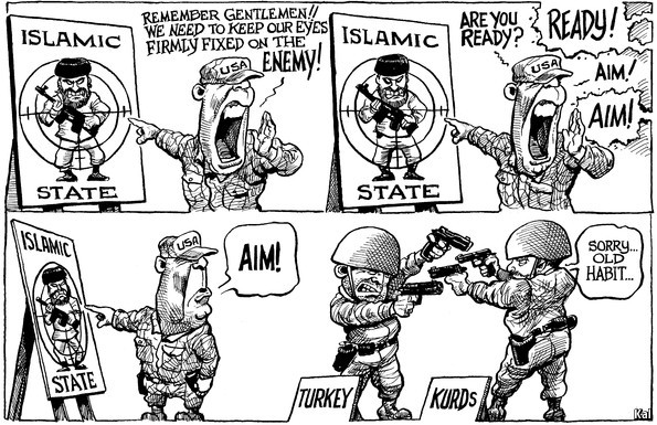 Το σημαντικό είναι να έχεις το νου σου πάντα στον εχθρό. Αυτό λέει ο αμερικανός αξιωματικός στους άνδρες τους δείχνοντάς τους τον στόχο που είναι το Ισλαμικό Κράτος. Μόνο εκείνοι, επειδή δεν μπορούν να αποχωριστούν τις παλιές τους συνήθειες, σημαδεύουν ο ένας τον άλλον. Οι στρατιώτες είναι η… Τουρκία και οι Κούρδοι.