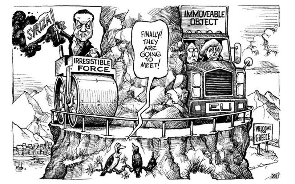 Το οικονομικό περιοδικό Economist, όπως κάνει κάθε χρόνο, ανασύρει από το αρχείο του εκείνα τα σκίτσα που λειτούργησαν πιο άμεσα στην καθημερινότητα –πολιτική, οικονομική και διπλωματική- και ουσιαστικά την τόνισαν με διαφορετικό τρόπο. Φυσικά, η Ελλάδα δεν θα μπορούσε να λείψει από τη χορεία των καλύτερων σκίτσων του έτους. Με τη μόνη διαφορά ότι ακόμη και η εύθυμη πλευρά της ελληνική περίπτωσης, εντέλει, δεν είναι καθόλου εύθυμη: ο οδοστρωτήρας ΣΥΡΙΖΑ, έρχεται να συναντήσει την νταλίκα που οδηγεί η Ανγκελα Μέρκελ και ο Βόλφγκανγκ Σόιμπλε.