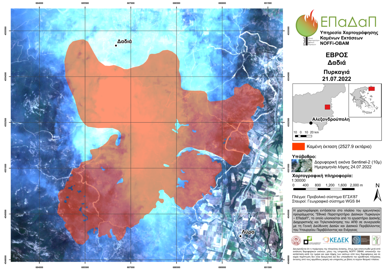 Περισσότερα από 25.000 στρέμματα καμένης έκτασης είναι η πρώτη εκτίμηση της καταστροφής από την πυρκαγιά στο δάσος της Δαδιάς στον Έβρο και αντίστοιχα περισσότερα από 17.000 στρέμματα από την πυρκαγιά στα Βατερά της Λέσβου. Στους χάρτες που παρήγαγε η υπηρεσία NOFFi-OBAM του Εθνικού Παρατηρητηρίου Δασικών Πυρκαγιών (ΕπαΔαΠ) απεικονίζονται οι καμένες εκτάσεις, με βάση την ανάλυση των πρώτων διαθέσιμων δορυφορικών εικόνων.