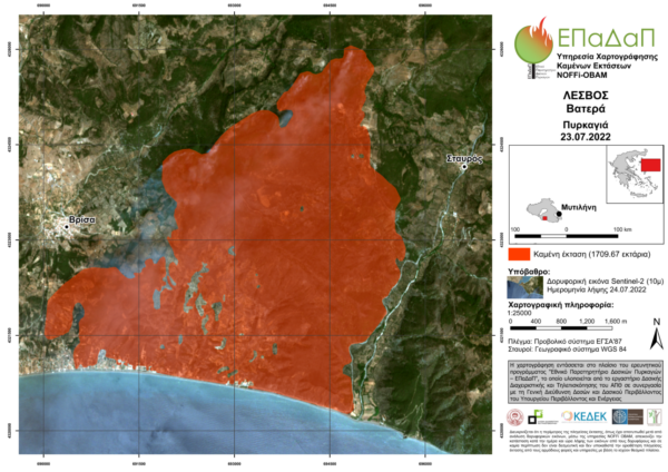 Σύμφωνα με την προεκτίμηση της Ομάδας του ΕπαΔαΠ, στην πυρκαγιά στη Δαδιά Eβρου (ημερομηνία έναρξης πυρκαγιάς 21 Ιουλίου) η καμένη έκταση υπολογίζεται σε 2527,9 εκτάρια. Στην πυρκαγιά στα Βατερά Λέσβου (ημερομηνία έναρξης 23 Ιουλίου), η καμένη έκταση εκτιμάται σε 1709,67 εκτάρια. Αναμένεται να εκτιμηθεί ακριβέστερα και η καμένη έκταση από την πυρκαγιά στην Πεντέλη (ημερομηνία έναρξης 19 Ιουλίου), όπου η πρώτη εκτίμηση αναφερόταν σε 2429,83 εκτάρια.