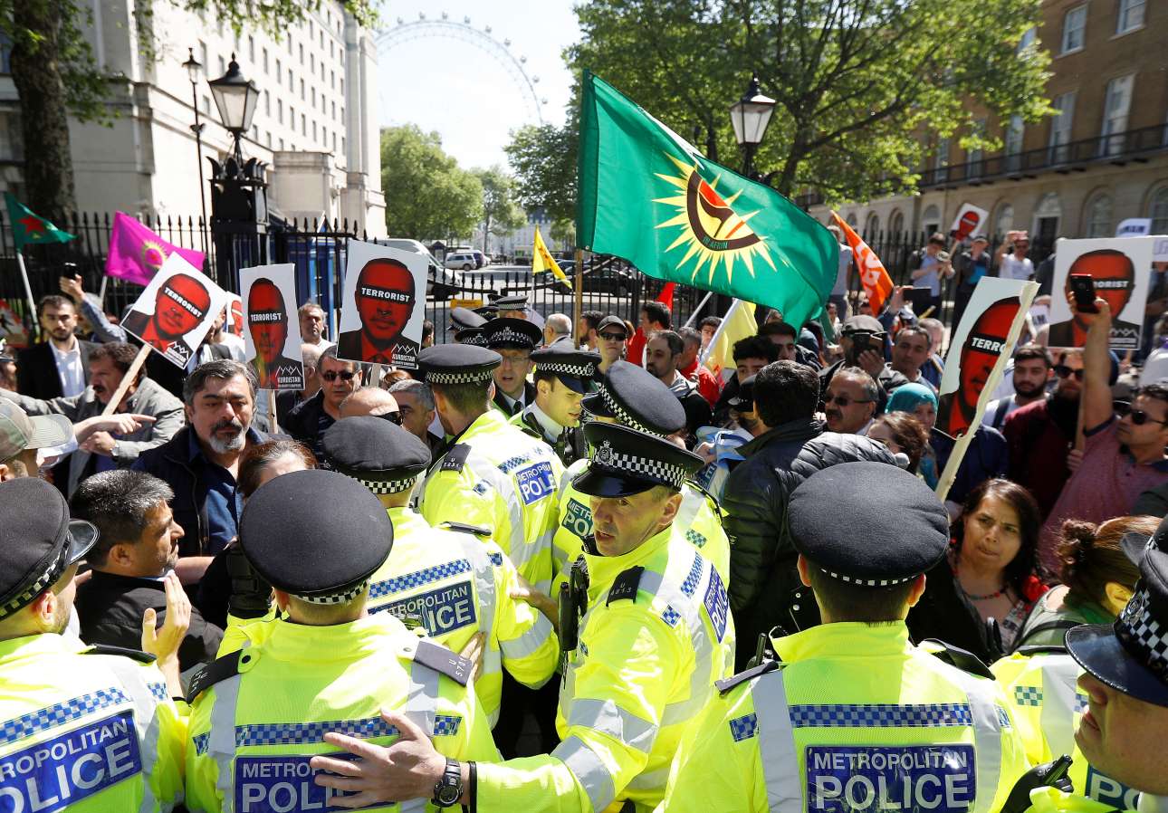 Για λίγα λεπτά επικράτησε ένταση στο κέντρο του Λονδίνου από μερικές εκατοντάδες κούρδους διαδηλωτές. Την ίδια στιγμή συγκέντρωση γινόταν και από φιλοπροεδρικούς διαδηλωτές.