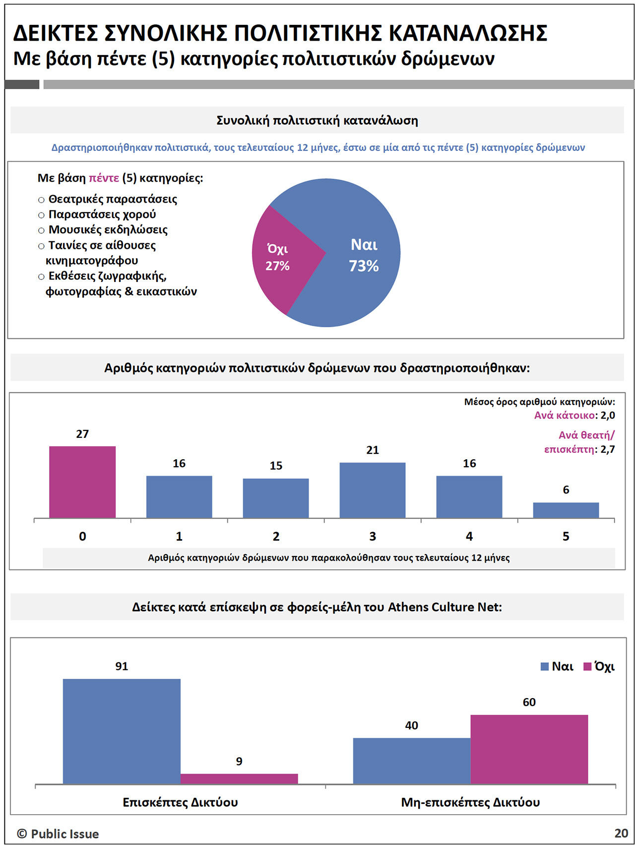 Βασική ένδειξη για τα παραπάνω, από τα συμπεράσματα της έρευνας, ήταν η πιο γενική: πάνω από τα 2/3 των δημοτών (της Αθήνας τουλάχιστον) έχουν εμπλακεί με τον Πολιτισμό τους τελευταίους 12 μήνες και το 65% των ερωτηθέντων έχουν παρακολουθήσει τουλάχιστον μία πολιτιστική εκδήλωση στους 44 φορείς του Δικτύου τον τελευταίο χρόνο. Και μπορεί να μην έχουμε συγκριτικά μεγέθη ή χρονοσειρά δεδομένων σε αυτό το πεδίο σε παλαιότερη ανάλογη έρευνα, αλλά και μόνον αυτό είναι ενθαρρυντικό, δεν είναι; Πόσω μάλλον αν δούμε ότι στις πολύ νέες ηλικίες το κατά μέσον όρο ποσοστό του 65% σκαρφαλώνει στο 83% και έως τα 45 στο 80%. Και κάτι ακόμη, βροντερό, ως συμπέρασμα: «Το 73% των Αθηναίων αγαπά τον Πολιτισμό». Χώρια μία ακόμη σοβαρή ένδειξη εντός οικονομικής κρίσης: Ακόμη και το 62% των ερωτηθέντων ανέργων παρακολούθησε τουλάχιστον μία εκδήλωση τους τελευταίους 12 μήνες.