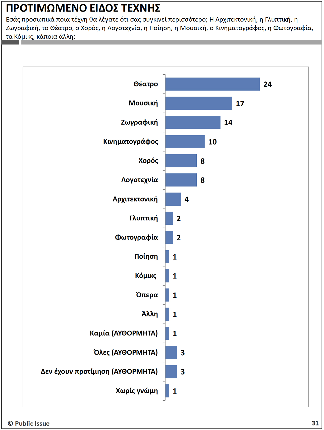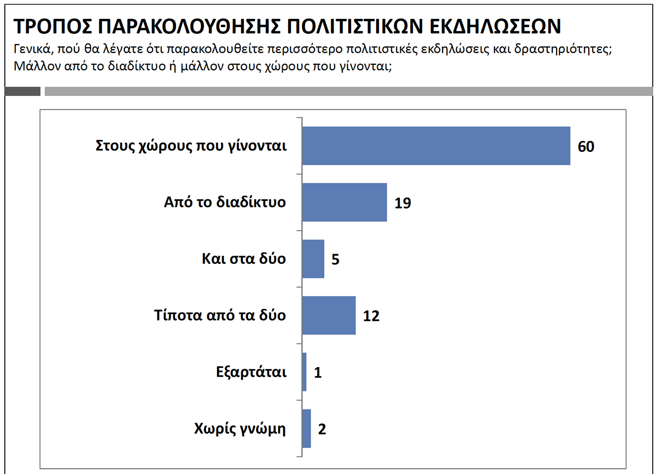 Τέλος, η έρευνα της Public Issue, εκτός του ότι καταδεικνύει σαφώς ότι η ενημέρωση για τα πολιτιστικά δρώμενα γίνεται κυρίως πλέον από το Διαδίκτυο και τα Μέσα Κοινωνικής Δικτύωσης (42%), με την τηλεόραση στη δεύτερη θέση αρκετά παρακάτω (29%). Κάτι που στις νεότερες ηλικίες σπάει ακόμη και το φράγμα του 70%… διαδικτυακώς.