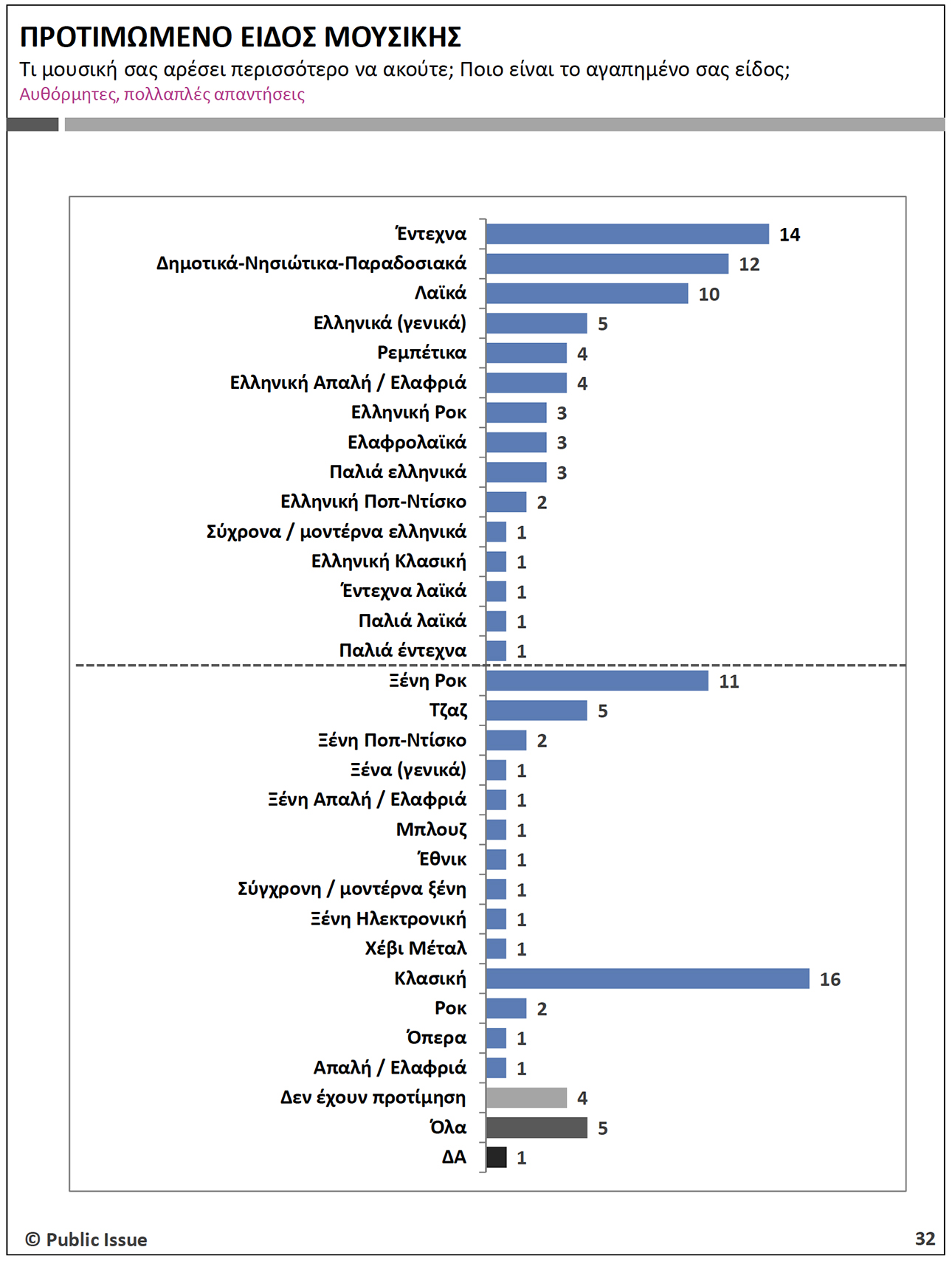 Να είναι και αυτό αποτέλεσμα της τάσης των ερωτηθέντων να απαντούν στερεοτυπικά ή πολιτικώς ορθά; Σαν εκείνα τα ποσοστά που και τούτη η έρευνα δίνει στην κλασική μουσική, ήτοι 16%! Με δεύτερη την έντεχνη μουσική με 14, τρίτη την παραδοσιακή (τα δημοτικά) με 12 και τέταρτο το ροκ με 11. Ή στον παλιό ελληνικό κινηματογράφο, τον οποίο «ψήφισαν» 39%, έναντι 26 του ευρωπαϊκού, παρακαλώ, κινηματογράφου και 17 του αμερικανικού.