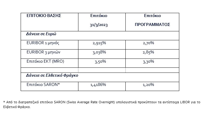 Ο νέος εκτοκισμός με τα δεδομένα του ΠΡΟΓΡΑΜΜΑΤΟΣ θα γίνει με το διατραπεζικό επιτόκιο αναφοράς, όπως είχε διαμορφωθεί στις 31/3/2023, μειωμένο κατά 20 μονάδες βάσης περίπου. Το επιτόκιο αυτό θα διατηρηθεί σταθερό σε όλη τη 12μηνη περίοδο, εκτός εάν στο πλαίσιο της νομισματικής πολιτικής το επιτόκιο αναφοράς μειωθεί σε χαμηλότερα επίπεδα. Ανάλογα με το επιτόκιο βάσης και το νόμισμα του δανείου, τα επιτόκια του ΠΡΟΓΡΑΜΜΑΤΟΣ διαμορφώνονται ως ακολούθως: