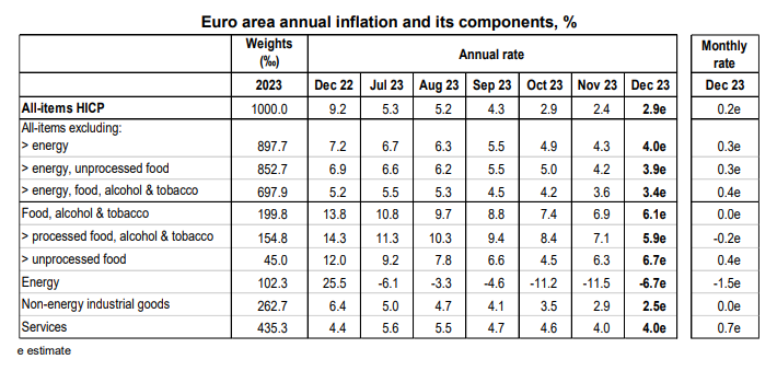 Εξετάζοντας τις κύριες παραμέτρους του πληθωρισμού στη ζώνη του ευρώ, τα τρόφιμα, το αλκοόλ και ο καπνός είχαν τον υψηλότερο ετήσιο ρυθμό ανόδου τον Δεκέμβριο (6,1%, έναντι 6,9% τον Νοέμβριο), ακολουθούμενες από τις υπηρεσίες (4%, σταθερό σε σύγκριση με τον Νοέμβριο), τα μη ενεργειακά βιομηχανικά αγαθά (2,5%, έναντι 2,9% τον Νοέμβριο).