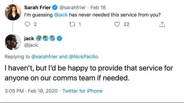 Για παράδειγμα, ο ιδρυτής και διευθύνων σύμβουλος του Twitter, Τζακ Ντόρσεϊ, σε σχετική ανάρτηση και μετά την ερώτηση της Σάρα Φράιερ, τόνισε πως δεν έχει ζητήσει ποτέ από μέλος του προσωπικού του να του στεγνώσει τις μασχάλες, αλλά «θα ήταν πρόθυμος να το κάνει ο ίδιος για κάποιον στην ομάδα επικοινωνίας του».
